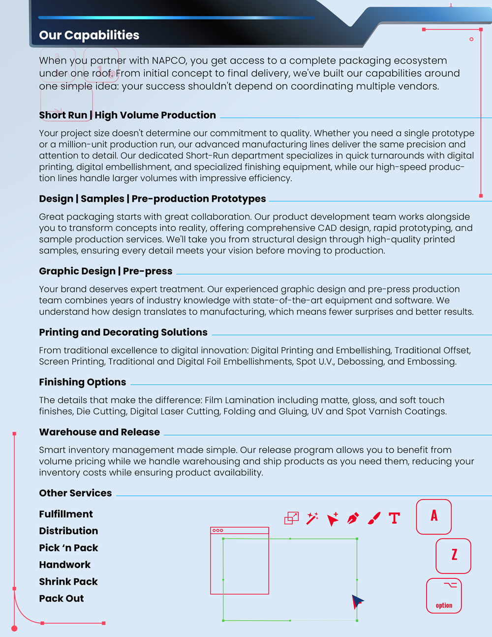 At NAPCO, our ultimate goal is to provide a single place for customers to go to for a full range of services, including product design and development, prototypes samples, graphic design and assistance, printing and manufacturing.